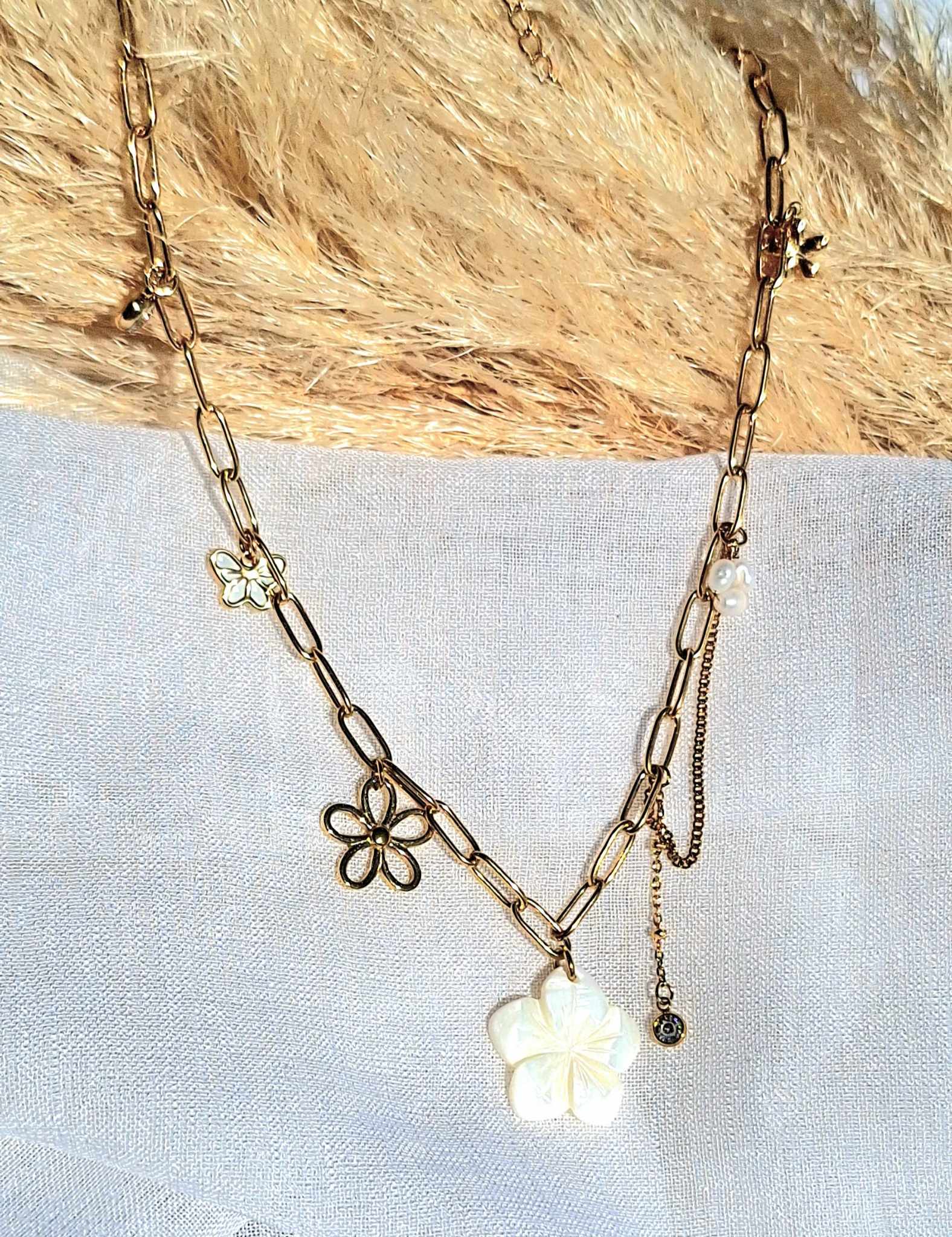 Finement travaillé, il mêle éclat doré et douceur naturelle grâce à ses breloques florales et ses perles de nacre, évoquant la beauté pure des lagons tropicaux.